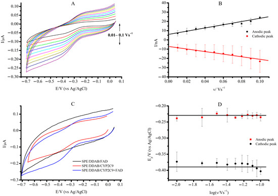 (A) CVs of SPE/DDAB/CYP2C9 + FAD in anaerobic conditions. (B) Scan rate dependence of the cathodic and anodic peak currents on the potential for SPE/DDAB/CYP2C9 + FAD. (C) CVs of SPE/DDAB/FAD (black), SPE/DDAB/CYP2C9 (red), and SPE/DDAB/CYP2C9 + FAD (blue) at a scan rate of 0.1 V/s. (D) Trumpet plots displaying the oxidation and reduction peak potentials with logarithm scan rate for SPE/DDAB/CYP2C9 + FAD. Measurement parameters: potential sweep rate from 0.01 to 0.1 V/s, potential range from 0.05 V to −0.7 V (vs. Ag/AgCl). The measurements were carried out in 1 mL of supporting electrolyte, 0.1 M potassium phosphate buffer (pH 7.4) containing 0.05 M NaCl.