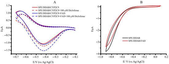 (A) The background-subtracted cyclic voltammograms of SPE/DDAB/CYP2C9, SPE/DDAB/CYP2C9 + FAD, and SPE/DDAB/CYP2C9, SPE/DDAB/CYP2C9 + FAD with 100 µM diclofenac, at a scan rate of 0.1 V/s. (B) Cyclic voltammograms of SPE/DDAB and SPE/DDAB/FAD.