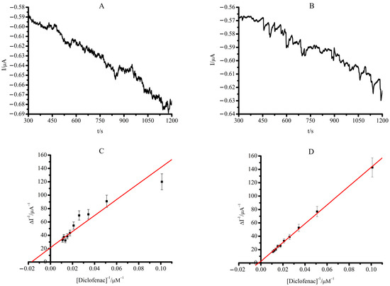 To assess the comparable kinetic parameters of the electrochemical systems, we performed amperometric titration of CYP2C9 + FMN and CYP2C9 + FAD immobilized on SPE/DDAB with diclofenac. The apparent Michaelis constants, KM, were calculated from electrochemical data using the electrochemical form of the Michaelis–Menten equation with Lineweaver–Burk linearization (Equation (3)). The amperometric and the Lineweaver–Burk diagram in double reciprocal coordinates of the dependence of the catalytic current of SPE/DDAB/CYP2C9 + FMN and SPE/DDAB/CYP2C9 + FAD electrodes for experimental amperometric titration of diclofenac are shown in Figure 5A–D.