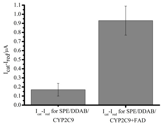 Differences between catalytic current Icat in the presence of 100 µM naproxen and reduction current Ired for SPE/DDAB/CYP2C9 and for SPE/DDAB/CYP2C9 + FAD.