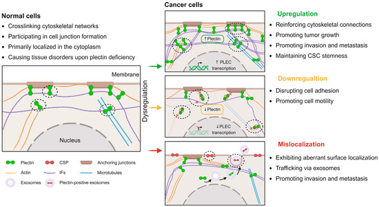 Although plectin deficiency is known to cause tissue disorders, a clearer understanding of plectin dysregulation and its implications in cancer is still necessary. In malignancies, the PLEC gene frequently undergoes copy number variations, leading to aberrant plectin expression, which is increasingly recognized as a potential hallmark of malignancy. More importantly, plectin in cancer cells often exhibits alterations in subcellular localization, shifting from its typical cytoplasmic distribution to the cell membrane. Here, we summarize the dysregulation of plectin, including its upregulation, downregulation, and mislocalization in different types of cancers, as shown in Table 1.
