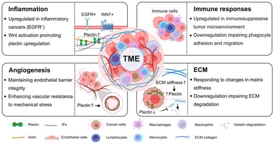 The TME comprises diverse cellular and acellular components that critically influence tumor growth, invasion, metastasis, and cancer therapy. Emerging evidence indicates that dysregulation of plectin plays a role in both the regulation and response to the TME. Specifically, plectin is upregulated in pro-inflammatory tumors and immunosuppressive microenvironments. Its upregulation enhances angiogenesis and vascular integrity, and mediates ECM mechanotransduction and gelatin degradation. These findings highlight the bidirectional role of plectin in the TME, where it drives remodeling of the TME and is dysregulated due to TME alterations (As shown in Figure 2).