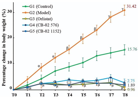 Percentage change in the BW of mice in different groups over time (Mean ± SE). T0: week 0; T1: week 1; T2: week 2; T3: week 3; T4: week 4; T5: week 5; T6: week 6; T7: week 7; and T8: week 8. α p < 0.05; β p < 0.01; γ p < 0.001 compared with G1; μ p < 0.001 compared with G2 (G3, G4, G5 vs. G2).