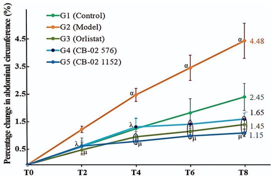 By the end of the 8-week experimental period (T8), AC had increased by 4.48% in the model group (G2) and by 2.45% in the control group (G1) compared to the baseline (T0). In comparison with the model group (G2), the groups treated with CB-02 and/or orlistat (G3, G4, and G5) exhibited significantly lower percentage increases in AC (p < 0.01 and p < 0.001, respectively). At T8, the percentage increased relative to T0 in the CB-02 576 and 1152 mg/kg/day groups, and the orlistat groups were 1.65%, 1.15%, and 1.45% (Figure 2).