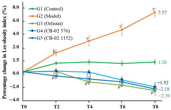 Percentage change in the Lee obesity index of mice in different groups over time (Mean ± SE). T0: week 0; T2: week 2; T4: week 4; T6: week 6; and T8: week 8. β p < 0.01, γ p < 0.001 compared with G1 (G2 vs. G1); μ p < 0.001 compared with G2 (G3, G4, G5 vs. G2).