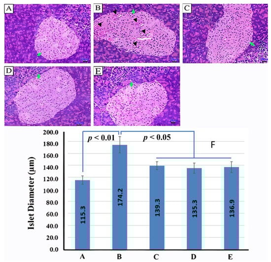 Histopathological features of H&E-stained pancreatic tissue and the islet diameter of Langerhans. (A): Control group (G1); (B): Model group (G2); (C): Orlistat group (G3); (D): CB-02 576 group (G4); (E): CB-02 1152 group (G5); (F): Islet diameter of Langerhans (Mean ± SE). Green arrows: the islets of Langerhans; black arrows: cellular morphological changes and disorganized tissue architecture. Scale bar: 20 µm.