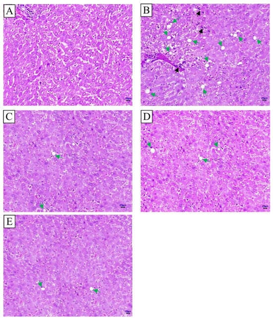 Histopathological features of liver tissue stained with H&E. (A): Control group (G1); (B): Model group (G2); (C): Orlistat group (G3); (D): CB-02 576 group (G4); (E): CB-02 1152 group (G5). Green arrows indicate lipid droplets within the hepatic parenchyma, and black arrows indicate infiltration of inflammatory cells. Scale bar: 20 µm.