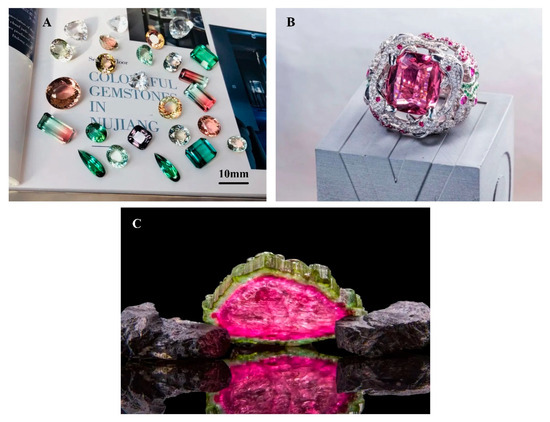 (A) High-clarity faceted tourmalines of rich color from the Nujiang region, Yunnan Province; scale bar = 10 mm. (B) The size of the ring is 26.6 × 24.8 × 31.8 mm. The photo was obtained from the Lan York Tourmaline Museum, which shows a single 26.88 ct natural pure red tourmaline, known as “Sulamima”, meaning the goddess of flowers, from a legendary story of the Nujiang River. (C) Natural watermelon tourmaline from the Nujiang region of Yunnan Province, known locally as “tourmaline candy”. The tourmaline crystal is 23 cm long, 17 cm at its widest point, and 1.5 cm thick on average; it weighs 877 g. Photo: Lan York Tourmaline Museum.