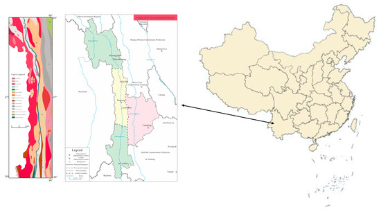 The three counties, Gongshan, Fugong, and Lushui, along the banks of the Nujiang River, host the main tourmaline mines of Yunnan Province. The regional geology and rock types that characterize the Nujiang Prefecture are presented in the right panel. Tourmaline is mainly produced from granite near river banks. The image was drawn by Yu.