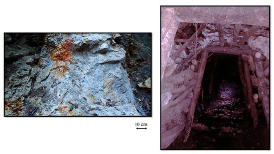 The left panel shows some pegmatitic veins hosting black tourmalines and feldspar crystals. The right panel shows a tourmaline mining adit in Yunnan Province.