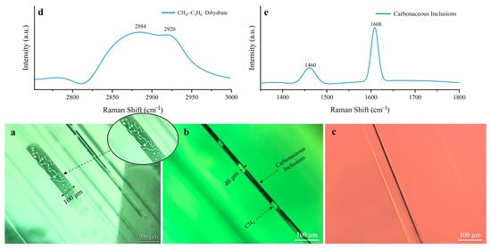 Typical inclusions in the tourmalines from Yunnan. (a,b) show regularly arranged tubular and black inclusions and gas–liquid inclusions within the tubes. (c) shows a tubular inclusion without carbonaceous material. (d,e) show the Raman spectra of the inclusions. The black inclusions are presumed to be organic matter (e), whereas the gas–liquid inclusions are presumed to be CH4-C2H6 (d). Photographs were taken by Yu, Li.