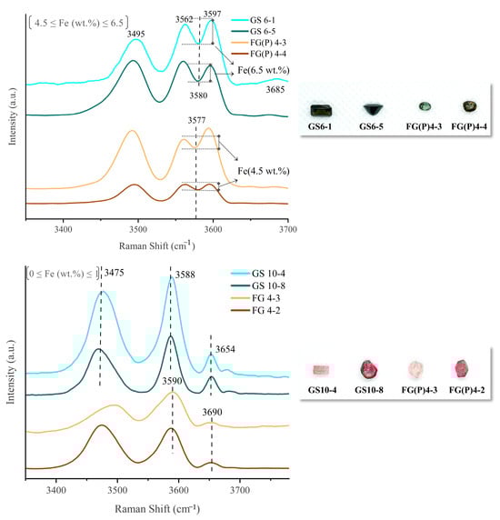 Tourmaline typically has three [OH] Raman stretching vibrational peaks in the 3480–3670 cm−1 range, with the 3660 cm−1 Raman peak being attributed to the OH1 group in the hexagonal ring center and the two vibrational peaks near 3475 cm−1 and 3588 cm−1 being attributed to the OH3 in the hexagonal ring corner [29]. The Raman peak at the position of 2800–3000 cm−1 may be the Raman peak produced by the CH4-C2H6 gas mixture, as observed in sample GS10-2. Eight samples from the Gongshan and Fugong areas of Yunnan Province are selected for Raman spectroscopy; four represent the green color, and four represent the pink color (Figure 11). The Raman vibrational peak near 3580 cm−1 of the green tourmaline samples is split into two peaks at 3562 and 3597 cm−1, which is related to the high Fe content [11] (upper panel of Figure 11). The Raman peaks in the green tourmalines between 3650 and 3690 cm−1 are suppressed by the presence of Fe, showing a very weak intensity (upper panel of Figure 11). Combined with the Fe content revealed by the LA-ICP-MS analysis, it is seen that when the Fe content in the tourmaline samples reaches 6.5 wt.%, the splitting of the peak at 3580 cm−1 is greater (GS6-1 and GS6-5 samples) than that of the tourmaline samples with an FeO content of 4.5 wt% (FG 4-3 and FG 4-4 samples). Therefore, the degree of splitting of the peak at 3580 cm−1 is positively correlated with Fe in the samples; the higher the Fe content, the more significant the division.