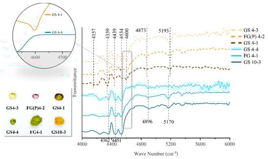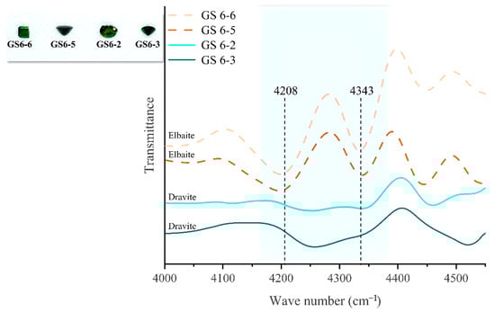 In the infrared spectrum of Yunnan tourmalines, 4000–4800 cm−1 is the frequency of the combination of Al, Mg, Fe, and a hydroxyl group. Different combinations of metal ions and hydroxyl groups will result in different performances in this band [36]. As shown in the general formula of tourmaline—XY3Z6(T6O18)(BO3)3V3W—the content of metal ions at the Y-site of the tourmaline structure varies significantly. The Y-site of elbaite usually occupied by about 65% of Al, and the remaining part by Li and Fe [2], respectively, and dravite at the Y-site has about 85% of Mg. Therefore, the IR spectra of elbaite and dravite from the same region of Yunnan are compared to verify the effect of different metal ions on the different ranges of the IR spectra. The spectra of Yunnan tourmaline in the near-infrared region of 4000–6000 cm−1 are shown in Figure 15.
