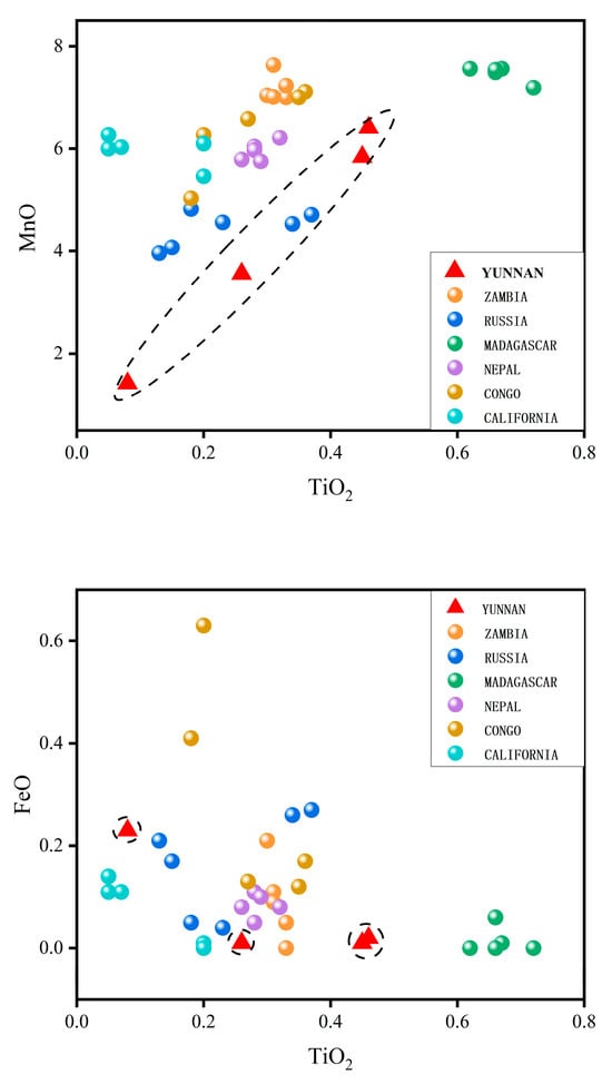 As shown in Table 5, Madagascar and Zambian tourmalines exhibit high MnO and low FeO contents, with significantly higher MnO levels than Yunnan tourmalines, with the Madagascar sample having an average MnO content of 7.47 wt.%, the highest among the samples from the other localities and fluctuating in a stable range of 7.19–7.56 wt.%. The Madagascar samples have the highest TiO2 content among the samples from the other localities, being 0.67 wt.%, which is 2–3 times higher than the other localities. As shown in Figure 18, Zambian tourmaline has the next highest content of MnO, with an average value of 7.18 wt.%, while the Fe content is higher than that of the Madagascar tourmaline, with some samples overlapping with Congolese tourmaline in the scatter plot. The MnO content of Nepalese tourmaline has small fluctuations ranging from 5.75 to 6.21 wt.%, while the TiO2 content is more stable at a range of 0.26–0.32 wt.%, falling in the middle region of the various origins, similar to California tourmaline. Because the element content of Yunnan tourmaline fluctuates greatly, it can be distinguished from Yunnan tourmaline according to the density in the scatter diagram. Russian tourmaline has a low MnO content; some samples have a high FeO content, which fluctuates less; and some samples overlap with the Yunnan region in the scatter plot. The MnO content of the Congo tourmaline samples reaches 6.4 wt.%, and the FeO content has large fluctuations in the range of 0.12–0.63 wt.% with an average of 0.26 wt.%.