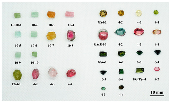 A total of 32 tourmaline samples from the Fugong and Gongshan counties and the surrounding areas of Yunnan Province (China) were studied. The studied samples include 18 faceted stones and 14 unpolished rough stones (Figure 20). The colors of the samples range from yellow to pink, dark green, and light green, with a transparent to translucent and glassy luster.