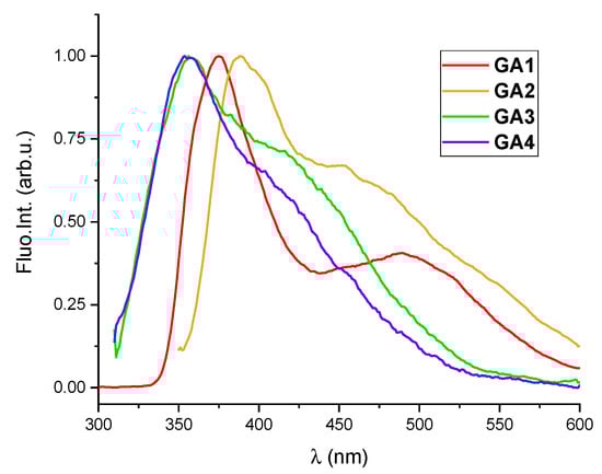 Fluorescence emissions of GA1-GA4 (Figure 1) were linearly dependent on their concentrations up to c = 4 × 10−6 mol dm−3. Excitation spectra recorded at emission maxima are in good agreement with UV/Vis spectra.
