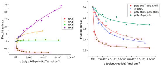 (Left) Normalised changes in fluorescence emission of GA1-GA4 (c = 2.5 × 10−6 mol dm−3) upon addition of poly dAdT-poly dAdT at pH 7 (Na-cacodylate buffer, pH = 7.0, I = 0.05 M; λexc = 300–325 nm); (Right) Normalised changes in fluorescence emission of GA1 (c = 2.5 × 10−6 mol dm−3) upon addition of ds-polynucleotides at pH 7 (Na-cacodylate buffer, pH = 7.0, I = 0.05 M; λexc = 300 nm); polynucleotide concentration was expressed as concentration of phosphates (nucleotides).