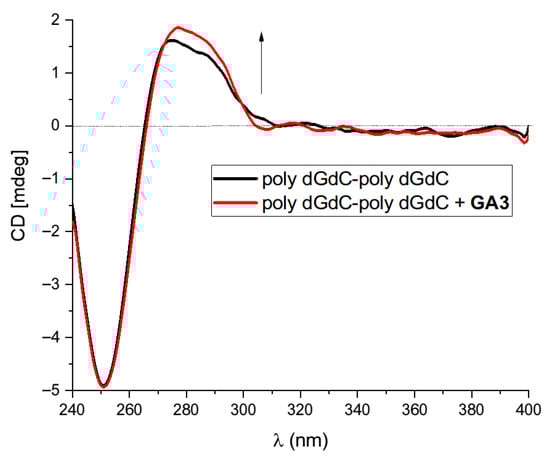 A minor groove of poly dGdC-poly dGdC is not suitable for groove binding because of the hinderance of protruding NH2 groups [30]; therefore, partial intercalation or electrostatic binding is possible for GC polynucleotides. Poly dGdC-poly dGdC CD spectra did not change after the addition of GA2 and GA4, while they showed a slight increase in the case of GA1 and GA3 (Figure 3).
