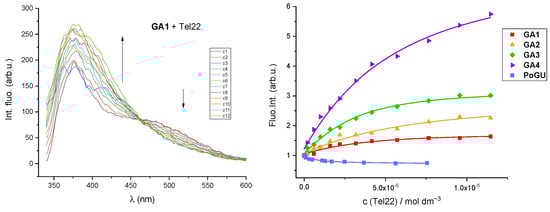 (Left) Fluorimetric titration of GA1, λexc = 300 nm and c = 2.5 × 10−6 mol dm−3 with Tel22. (Right) Normalised changes in fluorescence emission of GA1-GA4 and PoGU (c = 1–2.5 × 10−6 mol dm−3) upon addition of Tel22 G-quadruplex structure at pH 7 (Na-cacodylate buffer, pH = 7.0, I = 0.10 M; λexc = 300–325 nm for GA and λexc = 420 nm for PoGU).