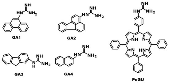The protonation of the basic guanidine group leads to the formation of a very stable guanidinium cation, whereby the delocalisation of the guanidinium cation’s positive charge through six π-electrons in the bonding orbitals forms a Y-delocalisation system [20]. Due to its ability for non-covalent interactions, namely, H-bonds, dipole–dipole, and cation–π interactions [21], molecules containing guanine can recognise important biomolecular targets and form complexes with them. Guanidine compounds exert their biological effects mostly through DNA/RNA minor groove binding [22], particularly through various types of non-covalent interactions: hydrogen bonds, van der Waals interactions, and non-specific electrostatic interactions.