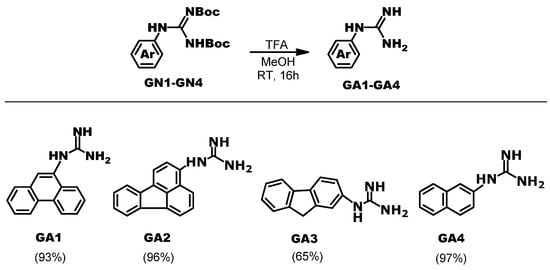 Aromatic guanidines GA1-GA4 were prepared by acidic deprotection of the Boc groups of guanidines GN1-GN4 (Scheme 2). Samples of Boc-protected guanidines GN1-GN4 were available from our previous work [24]. Guanidines GA3 [25] and GA4 [26] are known from the literature and have been prepared by different synthetic methods. Porphyrin guanidine PoGU was available from our previous study [23].