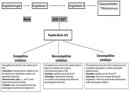 The above is not always the case, for some bioactive peptides like LW and IY, a noncompetitive inhibition has been reported. In the case of the peptides IW and FY, they have been cataloged as uncompetitive inhibitors [109,118]. It is worth noting that competitive ACE inhibitors have a practical limitation, as they must compete with the high physiological concentration of the natural substrate, angiotensin I. In this regard, noncompetitive and uncompetitive peptides like those mentioned above, which do not rely on substrate competition, may offer greater effectiveness [111]. The different mechanisms by which plant-derived peptides inhibit ACE are illustrated in a schematic representation in Figure 1.