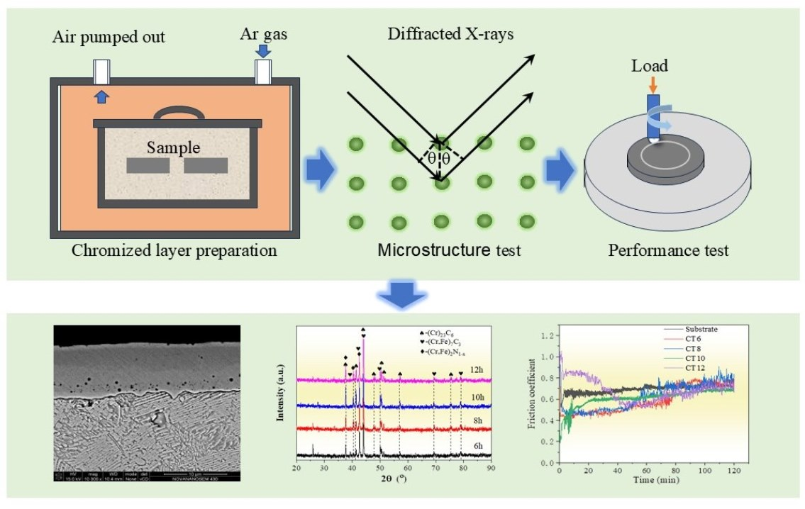 Additionally, compared with that of the GCr15 steel substrate, no adhesive wear phenomenon is found within the wear tracks of the chromized layer. The chromized layer is mainly composed of hard ceramic phases: (Cr,Fe)
