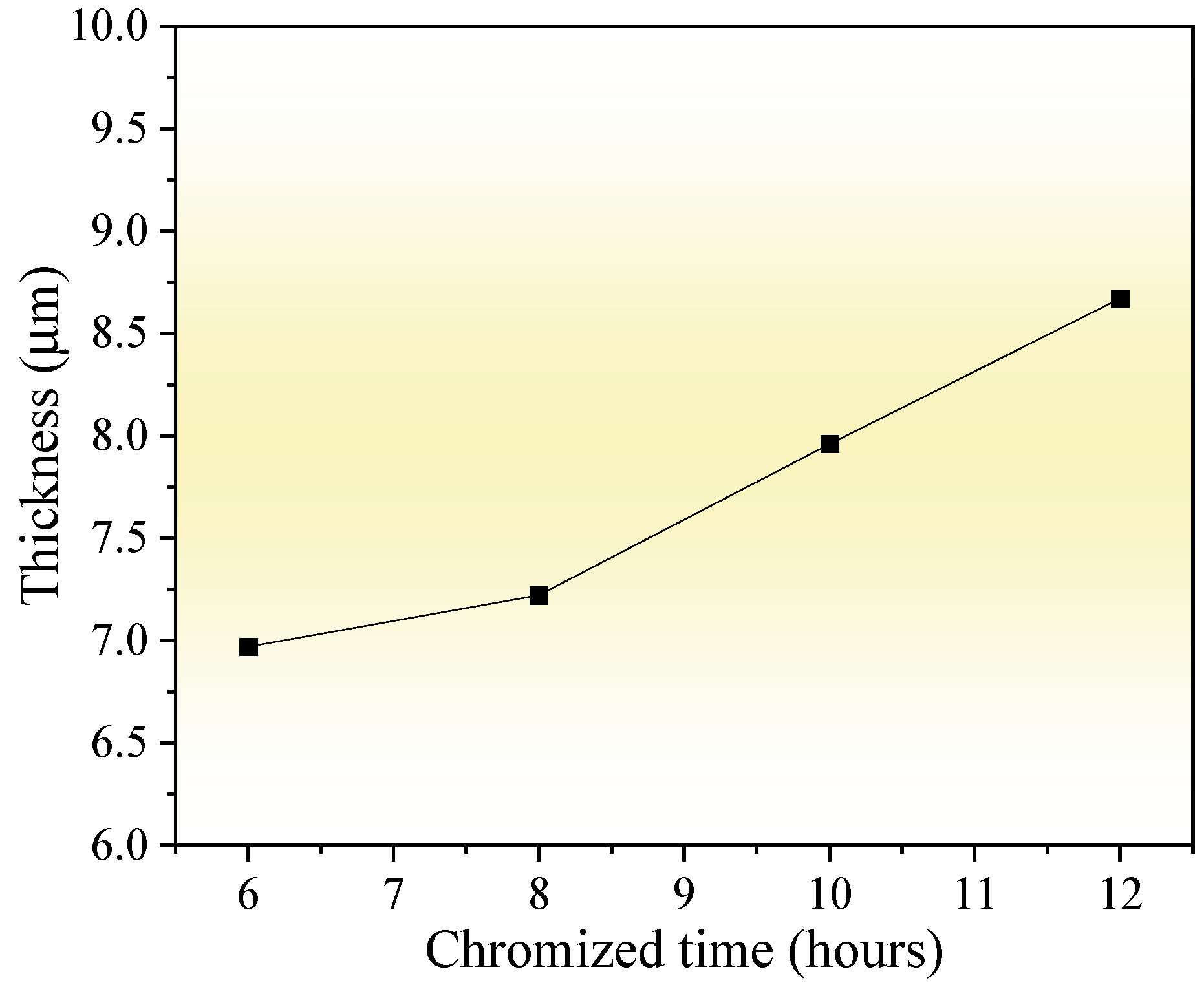 Figure 4 shows the thickness variation in the chromized layer under different chromizing times. As the chromizing time increases from 6 h to 12 h, the layer thickness exhibits a gradual growth from 6.97 μm to 8.67 μm. Previous research has shown that C content in the substrate significantly influences the thickness of the chromized layer. Liu T. et al. [