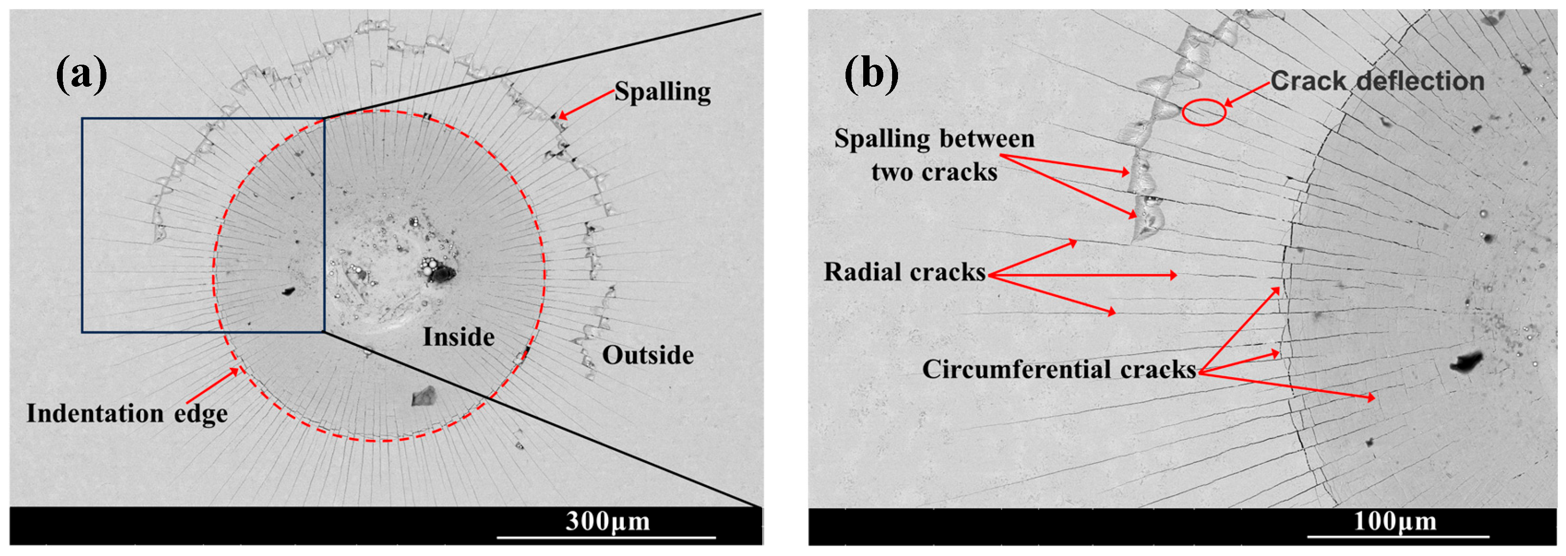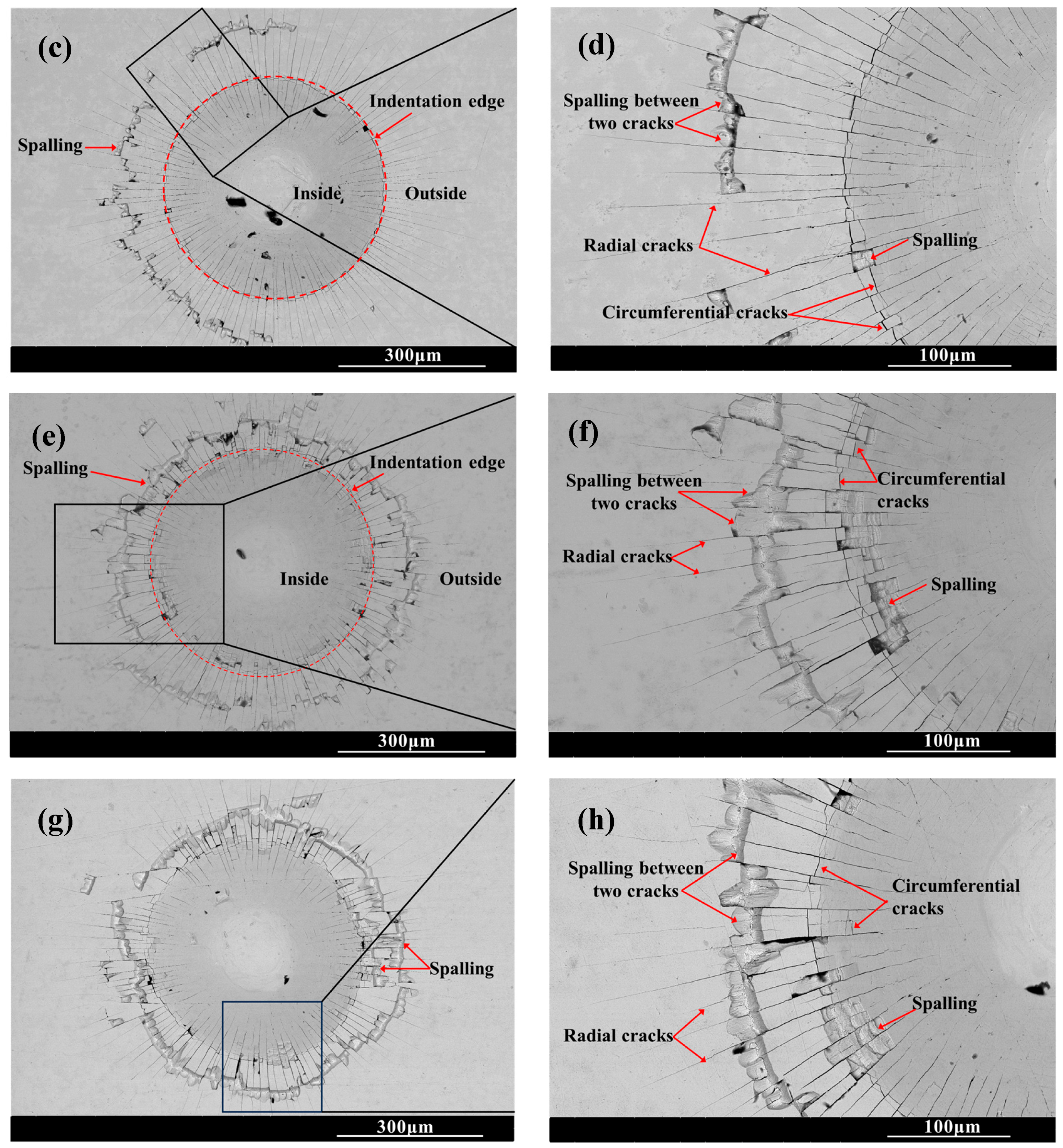 Figure 6 shows the SEM morphology of the indentation on the surface of the chromized layer. Numerous cracks exist within and around the indentation, where radial and circumferential cracks are observed inside the indentation zone, while radial cracks dominate the surrounding area. Radial cracks typically initiate inside the indentation, then propagate outward in a radial pattern through the indentation edge. Some radial cracks deflect and then continue to extend outward. Within the indentation zone, circumferential cracks appear to be discontinuous, terminating at radial cracks. That is, numerous discontinuous circumferential cracks exist between radial cracks, with coarser ones appearing at the indentation edge. The presence of circumferential cracks reflects fracture behavior in the material, indicating that the chromized layer inside the indentation has undergone fracturing, with the most severe fracture occurring and leading to the spalling around the indentation edge. Spalling tends to occur in enclosed regions formed by radial and circumferential cracks. The spalling regions surrounding the indention observed for CT6 and CT8 are relatively small, with minimal spalling at the indention edge. In contrast, CT10 and CT12 exhibited obviously larger spalling areas. The spalling zones surrounding the indentations are nearly completely interconnected, forming a continuous spalling circle. Furthermore, spalling at the indentation edge obviously increases and gradually propagates outward, merging with the outer spalling circle to form extensive spalling regions. This indicates that the brittleness of the chromized layer increases with prolonged chromizing time. Burnett P.J. et al. [