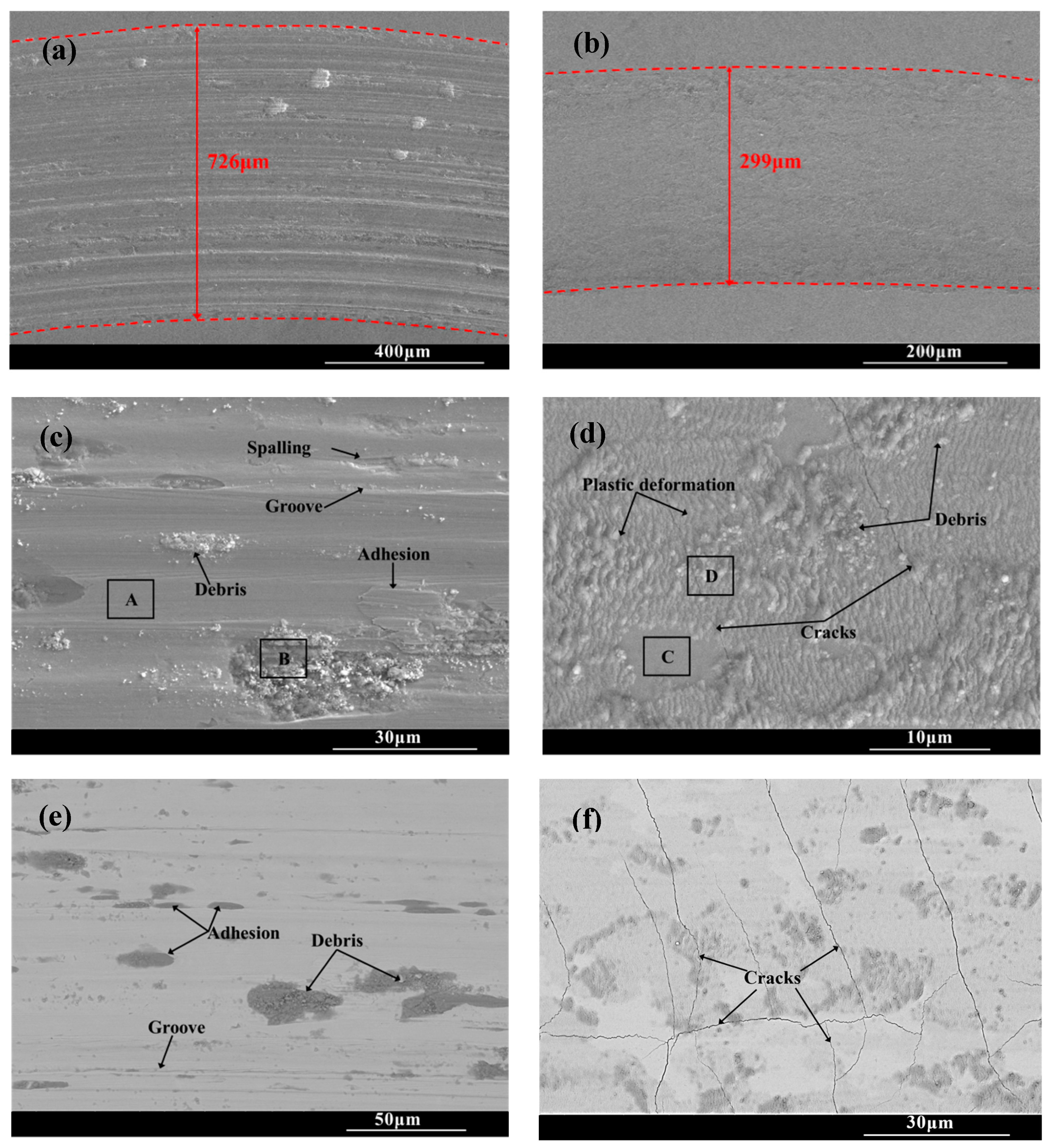 Figure 8d,f) reveal the presence of microcracks, plastic deformation zones and fine wear debris particles within the wear tracks. During the friction contact process, the material in the wear tracks is subjected to repeated shear stress and compressive stress, leading to plastic deformation as the material flows along the direction of the friction force. The thickness change in the deformation zone is inversely proportional to the hardness of the material. Generally, the material with large plastic deformation has lower hardness, while the material with higher hardness is more resistant to deformation. In the severe deformation zone, intense shear and contact stresses induce pronounced grain slip and flow, resulting in irregular deformation characteristics [