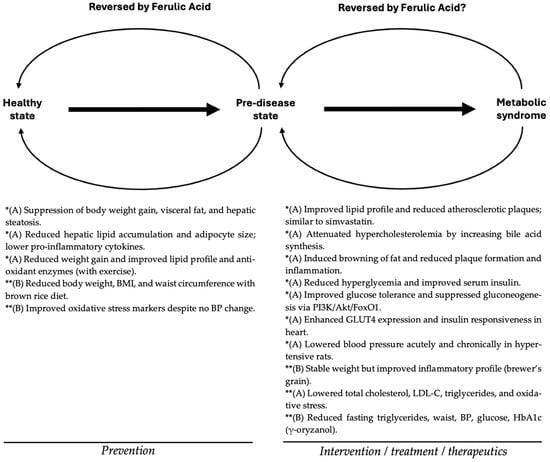 Figure 2 summarizes the preventive and therapeutic effects of FA and FA-rich foods and supplements against metabolic syndrome, based on the in vivo and clinical evidence discussed in this review. According to these studies, FA can act at multiple stages of disease progression. In the context of prevention, FA may halt or reverse the early metabolic disturbances associated with a pre-disease state, contributing to the maintenance or restoration of a healthy metabolic profile. On the other hand, FA has also shown therapeutic potential by improving key biomarkers and symptoms associated with established metabolic syndrome, including obesity, dyslipidemia, hyperglycemia, hypertension, and systemic inflammation. This preventive/therapeutic model has previously been applied to dietary phenolics such as chlorogenic acid [34] and to food juices [35,36].