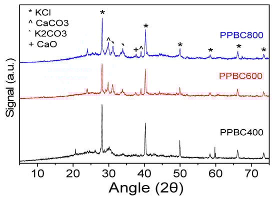 The crystallinity and phase composition of the potato peel biochar (PPBC) samples were investigated using XRD, as shown in Figure 1. All three samples exhibit distinct features associated with increasing thermal treatment, reflecting the progressive transformation of the organic matrix and the formation of inorganic crystalline residues. The XRD pattern of PPBC400 is characterized by a broad, low-intensity peak located at 2θ ~22–25°, indicative of amorphous carbonaceous structures. In addition, the diffraction peaks at 28.2°, 40.3°, 49.9°, 66.24°, and 73.61° are indexed to KCl (JCPDS No 411476). The increase in pyrolysis temperature to 600 °C (PPBC600) led to the formation of sharp diffraction peaks, particularly at 2θ 28–32°, 34°, 47°, and 56°, revealing the formation of additional inorganic crystalline phases. These peaks can be attributed to potassium and calcium-based mineral phases, such as KCl, K2CO3, CaO and CaCO3 [30,40]. Specific peaks located at 29.9° and 39° can be attributed to CaCO3 (JCPDS No 3612), while the diffraction peak at 37.7° matches with the CaO pattern (JCPDS No 11160). The diffraction peak located at 34° can be indexed to K2CO3 (JCPDS No 491093). The presence of these crystalline residues is often associated with the thermal decomposition of plant-derived minerals and seems to play an important role in the catalytic efficiency of biochar. At the highest pyrolysis temperature, (PPBC800), the intensity and sharpness of the diffraction peaks increase further, suggesting enhanced crystallinity of the inorganic residues. The peak positions remain largely consistent with those observed at 600 °C, implying stabilization of the crystalline phase composition. In addition, the primary crystalline size of all samples was estimated according to the Scherrer equation, and the results are shown in Table 1. It is observed that PPBC400 and PPBC600 are characterized by the same primary crystallite size equal to ~41 Å, while thermal treatment at 800 °C leads to a slight decrease in crystallite diameter (~36 Å).