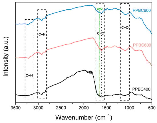 The FTIR spectra of the synthesized catalysts (Figure 2) display several characteristic absorption bands. A narrow band appears at around 3200 cm−1, corresponding to O–H stretching vibration, typically associated with adsorbed moisture. In the region between 2850 and 2950 cm−1 a broader band is observed, attributed to the symmetric and asymmetric vibrations of C–H bonds present in aliphatic groups (e.g., –CH2 and–CH3). The presence of these features indicates the retention of cellulosic and hemicellulosic structures in the biochar. In addition, a distinct band is observed at approximately 1600 cm−1, attributed to the stretching vibrations of the C=C bond found in aromatic groups. Finally, several weaker bands appear between 1100–120 cm−1 corresponding to C–O stretching vibrations, commonly associated with alcohols, ethers and esters [30]. Additionally, as the pyrolyzed temperature increased from 400 to 800 °C a weak narrow band at around 1700 cm−1 starts to become visible, corresponding to C=O stretching vibration.