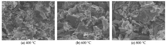 The surface morphology of potato peel-derived biochar samples calcined at 400 °C, 600 °C, and 800 °C and was investigated using SEM and representative images, as shown in Figure 3. It is observed that PPBC400 is characterized by a relatively smooth and dense surface, with a small number of observable pores or cracks, suggesting limited volatilization of organic components. The increase in calcination temperature to 600 °C led to higher surface heterogeneity, with pore formation and roughness indicative of progressive thermal decomposition of volatile matter. In addition, PPBC800 exhibited a markedly fragmented and porous structure. These morphological changes reflect the increasing carbonization and degradation of organic matter with temperature, potentially enhancing radical generation and degradation efficiency in carbon-based [30,40,41].