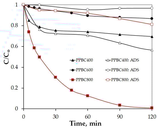 With respect to the catalytic performance of PPBCs, both PPBC400 and PPBC600 exhibited negligible pollutant degradation under the tested condition. Notably, PPBC400 not only was unable to activate persulfate, but also showed a slightly lower VEN removal compared to adsorption alone. This effect may be attributed to the adsorption of excess SPS molecules onto the biochar surface, which likely hindered the availability of active sites for VEN adsorption. In contrast, at 800 °C, the catalytic activity of the biochar led to complete VEN decomposition within 120 min. The high catalytic efficiency of PPBC800 may be due to a slight increase in SSA, smaller crystallite size, and higher graphitic carbon content, which probably facilitated electron-mediated reactions [45]. Based on the above findings, PPBC800 was selected for further investigation.