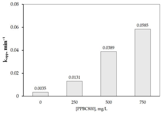 kapp values for 0.75 mg/L VEN adsorption and degradation for the examined biochars. Experimental conditions [PPBC] = 500 mg/L and [SPS] = 500 mg/L in UPW. In all cases, R2 > 0.97.