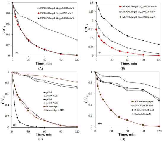 (A) Effect of initial concentration of SPS on the degradation of 0.75 mg/L VEN with 500 mg/L PPBC800 at pH = 7 in UPW. (B) Effect of initial concentration of VEN on its degradation with 500 mg/L PPBC800 and 500 mg/L SPS at pH = 7 in UPW (numbers in brackets show apparent rate constants). (C) Effect of initial pH solution on the degradation and adsorption of 0.75 mg/L VEN. Experimental Conditions: [PPBC800] = 500 mg/L, and [SPS] = 500 mg/L in UPW. (D) Effect of scavengers on 0.75 mg/L VEN degradation with 500 mg/L PPBC800 and 500 mg/L SPS in UPW.