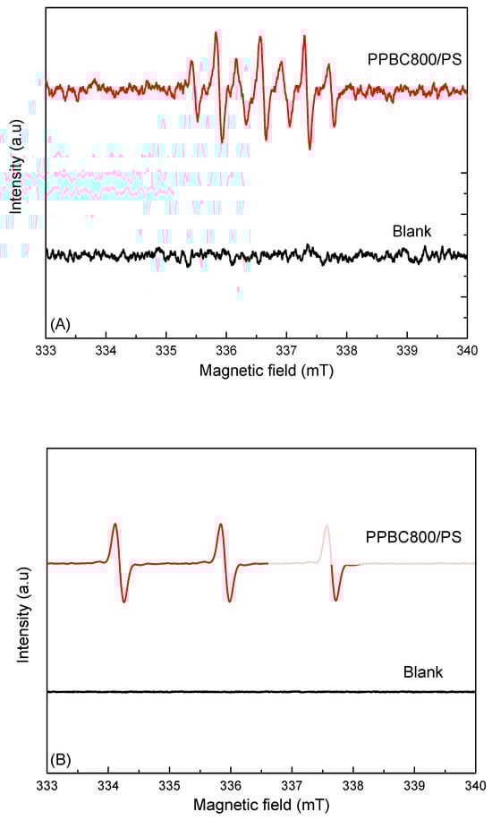 To further elucidate the reaction mechanism, additional EPR measurements were performed using DMPO (radical spin trap) and TEMP (singlet-oxygen probe) and representative spectra are shown in Figure 7. The DMPO spectra exhibited the broad, seven-line DMPO-X pattern rather than the characteristic DMPO– or DMPO–•OH adducts typically observed in radical-dominated persulfate systems. Given the absence of these adducts and the prevalence of the DMPO–X signature (arising from secondary oxidation of DMPO), radical pathways do not dominate under our conditions. Oxidation of TEMP to TEMPO was clearly detected, providing direct evidence for the generation of singlet oxygen in the PPBC800/persulfate system. Taken together, the EPR data, in concert with the scavenging results, indicate a mixed radical/non-radical pathway, with any /•OH contribution likely minor or short-lived and below our detection limit, while non-radical oxidation (via 1O2 and surface-mediated electron transfer) prevails.
