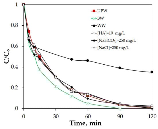 A complex array of inorganic anions, cations, and natural organic matter (NOM) is present in natural waters that can inhibit or promote process efficiency, mainly due to the scavenging or alteration of the produced reactive species [53,54,55].