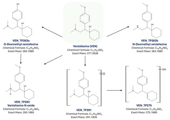 The following supporting information can be downloaded at https://www.mdpi.com/article/10.3390/molecules30183720/s1. Figure S1. Experimental MS/MS spectra of [M + H]+ ions of VEN and its detected TPs acquired by data-dependent acquisition mode. Table S1. Advanced oxidation processes for venlafaxine (VEN) removal.