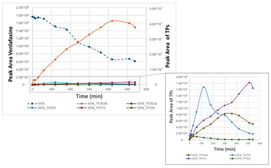 In addition, the time-trend profiles of venlafaxine and its TPs degradation obtained through RPLC-ESI(+)-TIMS-QToF analysis are presented in Figure 10. These profiles reveal distinct behaviors among the various TPs formed during the degradation process. The most abundant transformation product was VEN_TP263b (N-desmethyl venlafaxine), which exhibited a continuous and steady increase in abundance with time, reaching a maximum at the end of the experiment (510 min). This pattern suggests that VEN_TP263b is a relatively stable metabolite that accumulates as venlafaxine is progressively degraded. Similarly, VEN_TP275 followed the same trend, with a gradual increase in abundance over the experiment. In contrast, VEN_TP293 revealed a different time-trend profile, reaching its maximum abundance within the first 120 min of the experiment, followed by a rapid decrease. This pattern suggests that VEN_TP293 may subsequently be transformed or further degraded into other transformation products. Also, VEN_TP291 reached the maximum levels in the middle of the experiment, indicating that it may arise as a secondary transformation product. Finally, VEN_TP263a was detected at low abundance initially but increased sharply within the first 15 min. This observation supports the hypothesis that VEN_TP263a could serve as a precursor or intermediate in the sequential transformation process leading to other, more abundant TPs.