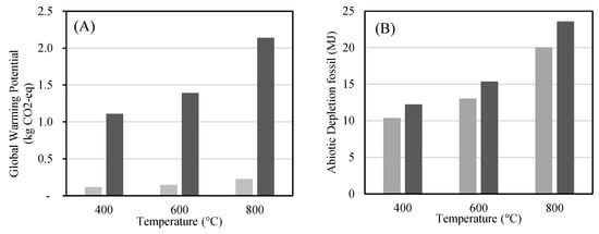 The Life Cycle Assessment results for the production of 1 kg of biochar from potato peels under three different pyrolysis temperatures (400 °C, 600 °C, and 800 °C) are presented in Figure 11, for the indicators Abiotic Depletion Potential–fossil fuels (ADP-fossil) and Global Warming Potential (GWP), respectively. Each scenario was evaluated for two energy supply systems: natural gas and electricity from EU grid mix.