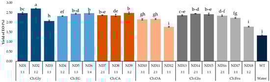 EO yields were in the range of 1.33–2.70%. The highest yield was obtained using Ch:Gly at a molar ratio of 1:2 (ND2) as NADES. Therefore, it was selected for further investigation. It is worth mentioning that, although not giving the highest extraction yield, NADES composed of Ch:EG, Ch:CA and Ch:Glu provided remarkable high yield at 2.32–2.48% for all ratios in this study.