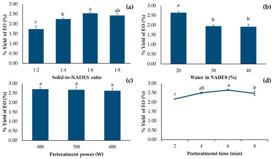 EO yield from F. vulgare with different (a) amount NADESs (b) water content in NADES (c) pretreatment power and (d) pretreatment time. Abbreviations are as follows—NADES: Natural deep eutectic solvent; EOs: Essential oils. Data are presented as mean ± standard deviation (SD) from n = 3 independent experiments. Different lowercase letters indicate significant differences among groups based on Tukey’s pairwise comparison test (p < 0.05); bars sharing the same letter are not significantly different, while bars with different letters are significantly different in the measured response.