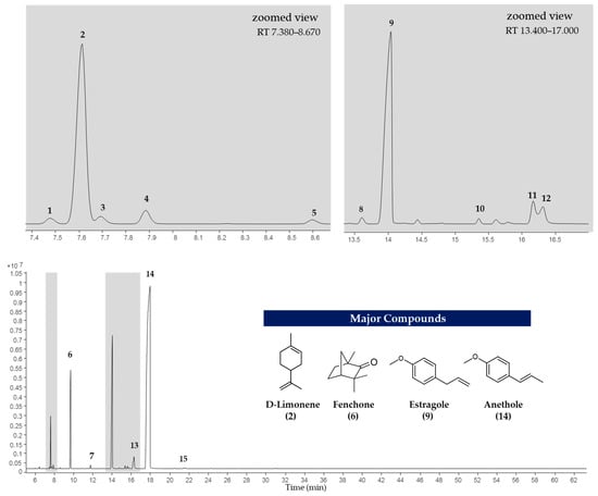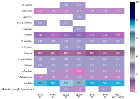The EOs of F. vulgare extracted using each type of NADES, as well as those extracted with water (without NADES), were analyzed for their chemical constituents using GC-MS. The total ion chromatogram is shown in Figure 4, and the results are summarized in Figure 5 and Figure 6. Based on the data (Table 4), a total of 15 volatile compounds were identified and quantified across the three groups, including 4 monoterpene hydrocarbons (MHs), 5 oxygenated monoterpenes (OMs), and 6 phenylpropanoids (PPs), as shown in Figure 6. Of all EOs, the major compounds were phenylpropanoids (PPs), specifically anethole and estragole. It is worth noting that all EOs consisted of anethole at the minimum level of 71.01% except that obtained by using Ch:OA as NADES, in which anethole was only 67.59%.
