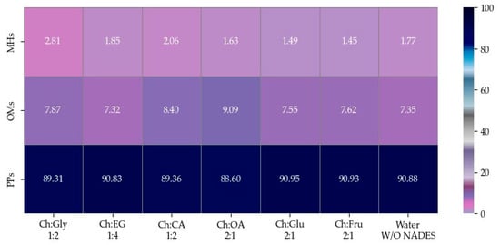 Due to the similar dipole moments of glycerol and ethylene glycol, NADESs based on Ch:Gly and Ch:EG showed comparable extraction yields. For carboxylic acids, an overall yield of EOs from Ch:CA was found to be higher than that of Ch:OA. This effect can be attributed to the intrinsic properties of citric acid, which exhibits a relatively high dipole moment and an abundance of hydroxyl and carboxyl groups, thereby promoting extensive hydrogen-bonding interactions that enhance the structural stability of the system [27].