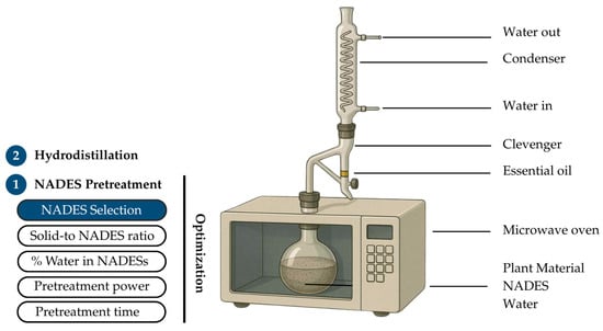 Additionally, pretreatment is essential for overcoming the natural resistance of plant cell walls and enhancing the release of intracellular bioactive compounds. Recently, deep eutectic solvents (DESs) have emerged as a novel class of green solvents offering a promising alternative for such applications. They are typically made by mixing hydrogen bond donors (HBD) and hydrogen bonds acceptors (HBA) in various molar ratios; this results in a combination that has a lower melting point because of the hydrogen bonding. Low toxicity, affordability, biodegradability, broad liquid range, low vapor pressure, non-flammability, chemical and thermal stability, ease of synthesis with excellent purity, water compatibility, and strong solubilizing power are only a few benefits of DESs. DESs made from solely natural substances are termed natural deep eutectic solvents (NADESs) [9]. NADESs have emerged as versatile green solvents, enabling the efficient extraction of diverse bioactive compounds from plants through a variety of advanced extraction techniques. Antioxidant compounds from Thai pigmented rice bran [10], Anthocyanins from chokeberry fruit [11] and from black raspberry [12], hydrophilic and lipophilic compounds from brown seaweeds [13], and coumarins from Angelicae pubescentis [14] were obtained by ultrasonically assisted extraction (UAE) with the assistance of NADES. Curcuminoids were reported to be extracted from turmeric by heating turmeric powder in the presence of NADES [15]. NADES were demonstrated as promising green solvents that can efficiently extract triterpene saponins from Aralia elata roots, in some cases outperforming conventional alcohol-based methods [16]. Microwave-assisted hydrodistillation (MAHD) is an advanced technique that overcomes limitations of traditional methods by enabling faster and more efficient extraction of essential oils from diverse plant materials. MAHD utilizes microwave radiation to heat the water within plant cells, leading to evaporation and expansion that generate high internal pressure. This pressure stretches and may rupture the oil gland cell walls, thereby facilitating the release of essential oils or bioactive compounds. The process benefits from a synergistic effect of heat and mass transfer, which work together to enhance extraction efficiency. Compared to conventional methods, MAHD is a green and innovative extraction technique that offers rapid extraction, higher essential oil quality and yield, energy efficiency, cost-effectiveness, and minimal solvent usage, thereby reducing both cost and environmental impact [17]. However, the technique also has limitations, particularly the risk of thermal degradation of thermo-sensitive compounds under excessive microwave power or prolonged heating that influence yield and product quality [18]. NADESs have been mostly used with microwave-assisted extraction method [19]. Rapid heating by microwave together with the advantages of NADES make this combination attractive. The microwave hydrodistillation based on deep eutectic solvent has been applied in the extraction of EOs from Amomum Species [20], Liquidambar formosana leaves and fruits [21], and turmeric [22]. In addition, we previously reported the use of DES-based microwave-assisted hydrodistillation (DES-MHD) and ultrasonic-assisted DES pretreatment followed by microwave-assisted hydrodistillation (U-DES-MHD) of clove [23].