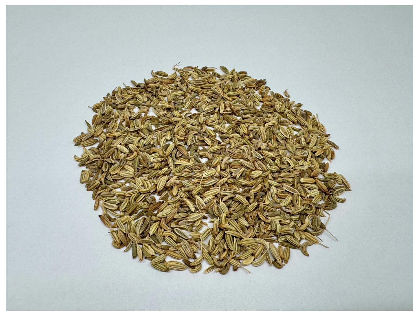 - Sabzi Nojadeh, M.; Pouresmaeil, M.; Younessi-Hamzekhanlu, M.; Venditti, A. Phytochemical profile of fennel essential oils and possible applications for natural antioxidant and controlling Convolvulus arvensis L. Nat. Prod. Res. 2021, 35, 4164–4168. [Google Scholar]