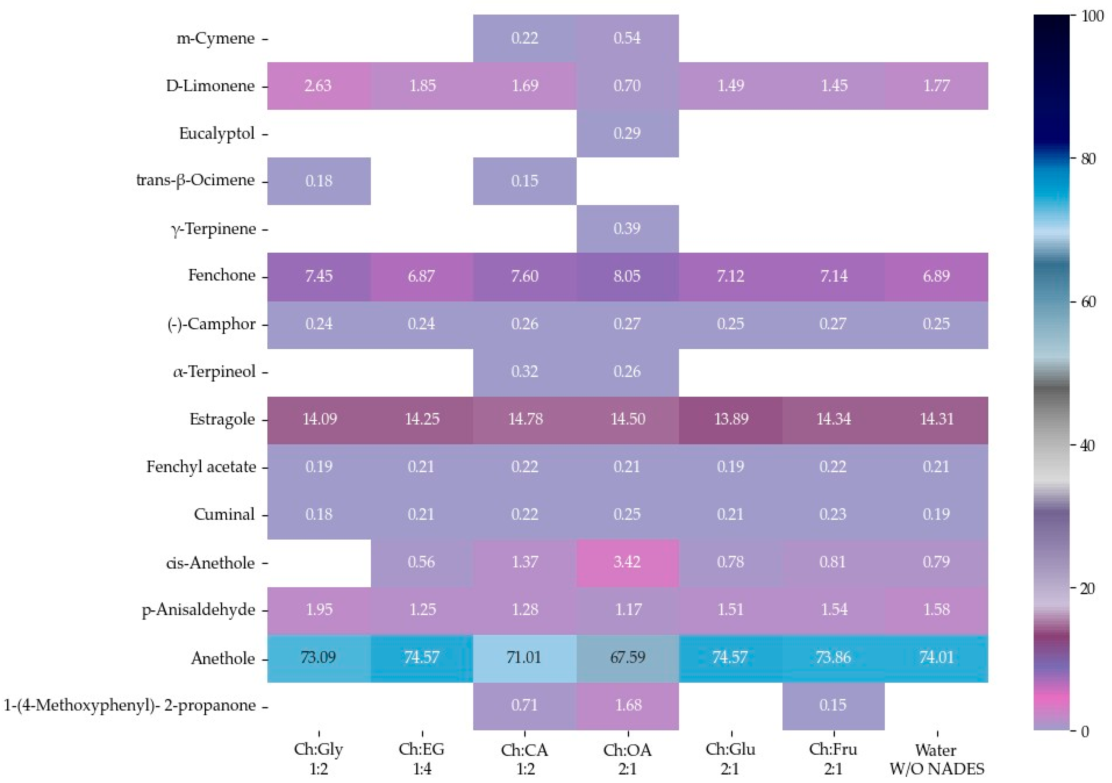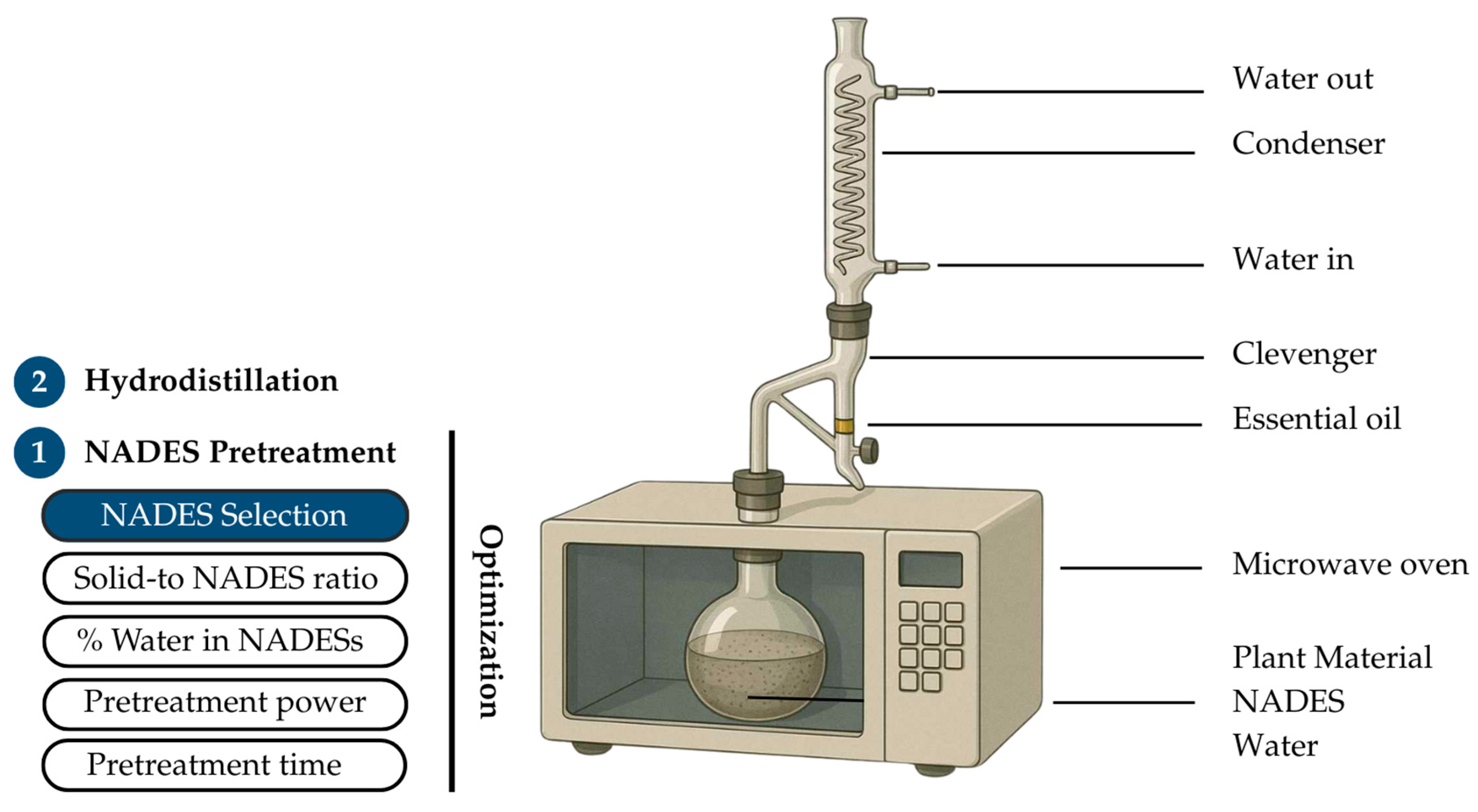 - Acosta-Vega, L.; Cifuentes, A.; Ibáñez, E.; Galeano Garcia, P. Exploring natural deep eutectic solvents (NADES) for enhanced essential oil extraction: Current insights and applications. Molecules 2025, 30, 284. [Google Scholar] [CrossRef] [PubMed]