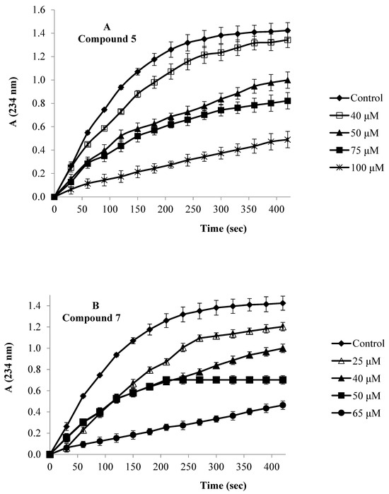 The effect of the most active compounds 5 and 7 on the progression of LOX activity is shown in Figure 1A,B.